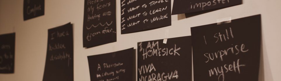Acclaimed local photographer, Wing Young Huie, leads Chalk Talks throughout Twin Cities’ middle and high schools and often partners with Heartland schools. Wing believes that much of society’s anxiety and violence is rooted in the belief that people who are different are dangerous. Sighting the ever-present “stranger danger” mantra that parents teach their kids, Wing instead encourages students to learn about people they don’t know and have an “authentic conversation.” He instructs students to ask one another “who are you?,” and points out that it is almost impossible not to be truthful when the question is posed by a stranger in a open-minded space–which he creates in the classroom–where all voices are welcomed and heard. After this truth-telling, students write what they want about themselves, expressing who they are, right then.